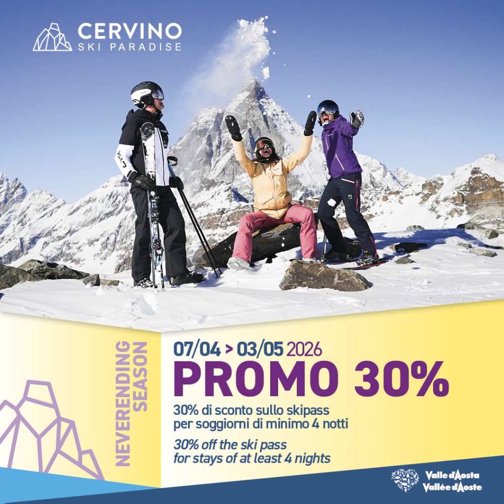 Dal 7 aprile 2026, la località turistica offrirà uno sconto sullo skipass pari al 30%, riservato agli ospiti che pernotteranno in una delle strutture alberghiere convenzionate per almeno 4 notti, ovvero con la volontà di usufruire di almeno 4 giornate sulle piste tra Breuil-Cervinia, Valtournenche e Zermatt, collegate tra loro sci ai piedi.